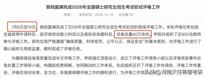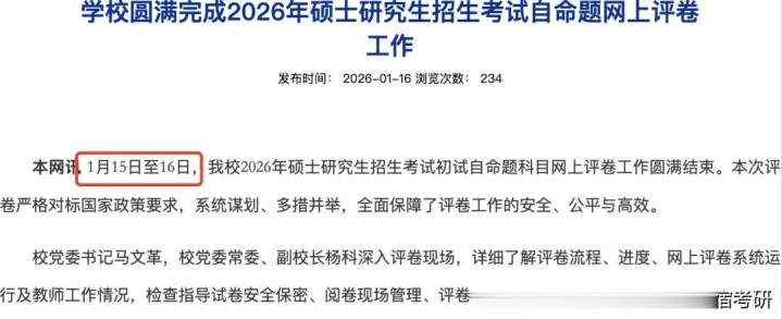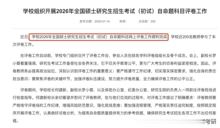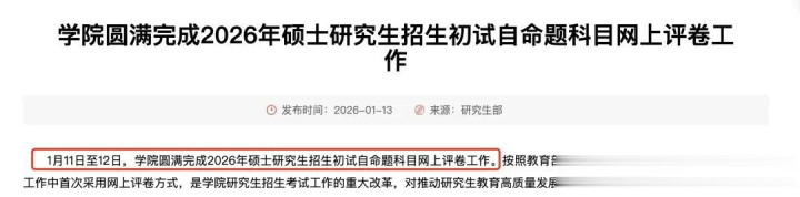 进入1月中旬,全国多所高校陆续完成了2026年硕士研究生招生考试初试自命题科目的评卷工作,标志着考研初试环节进入最后阶段。