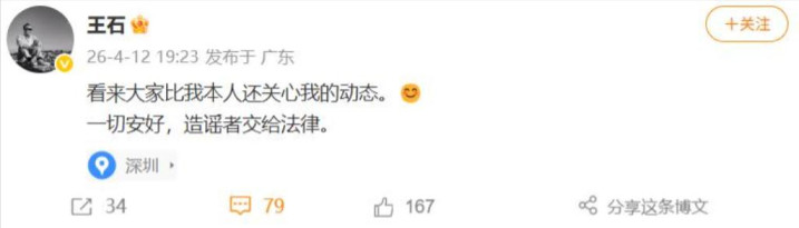 另外,王石在一又友圈用深圳定位,回复外传也惟一“一切安好”四个字。两组四字短句,一组是结尾,一组像是续命。